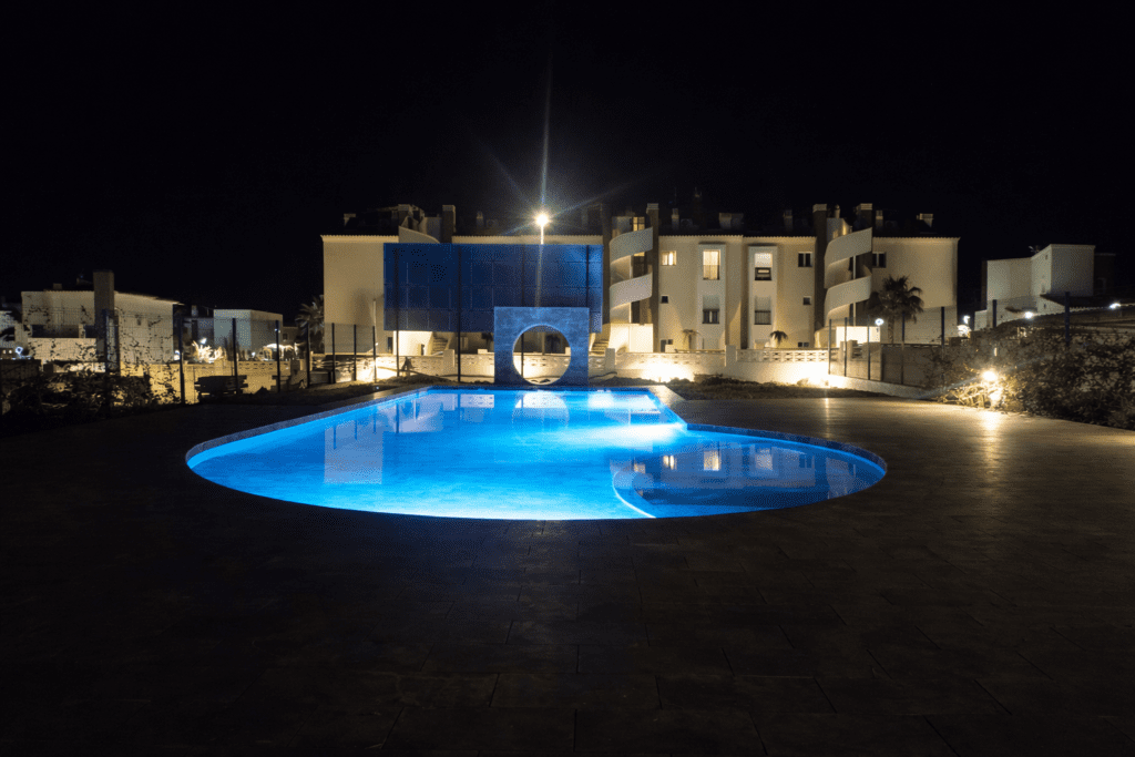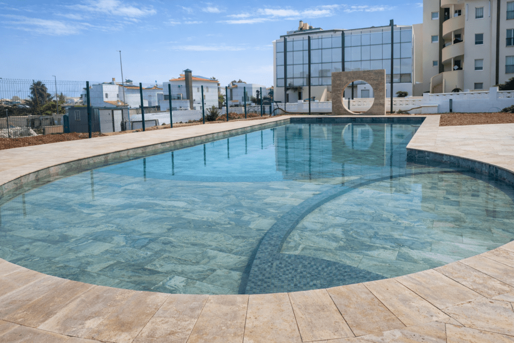 Lake-effect swimming pool with Bali stone style finish, designed to create an elegant and relaxing atmosphere.